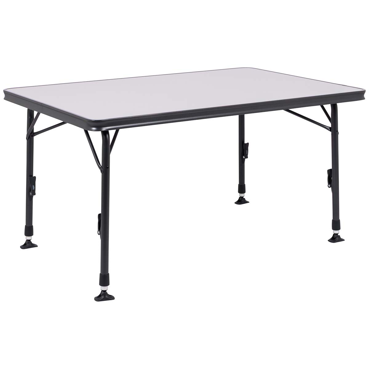 Mesa muy ligera y estable. Fabricación especial que la hace más fácil de abrir y plegar. Posee un sistema de guía por railes bajo el tablero que permite bloquear las patas muy rápida y fácilmente. Este mismo rail bajo el tablero le proporciona una estabilidad extra. La alta calidad de los materiales utilizados y el tablero HPL (laminado alta presión) resistente a altas temperaturas y humedad aseguran una gran durabilidad. Las patas están fabricadas con tubo de aluminio reforzado extra grueso (28mm.) Esta mesa tiene conteras estabilizadoras autonivelables, que le confiere una gran estabilidad en cualquier superficie. Muy ligera por su estructura de aluminio.