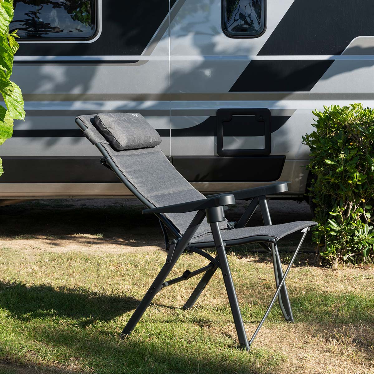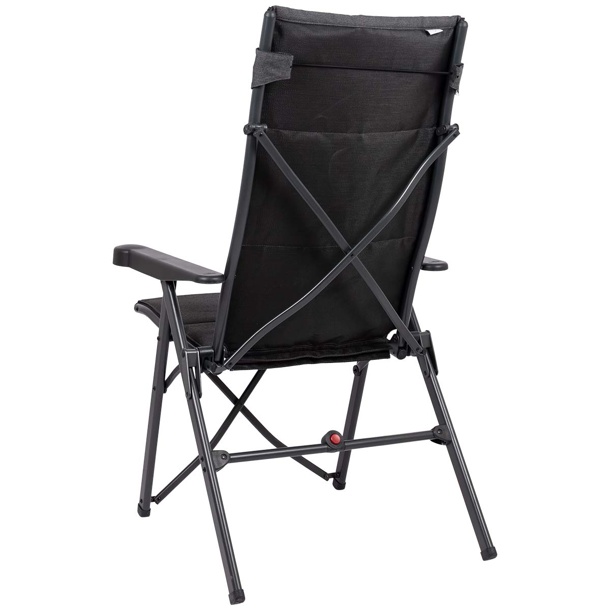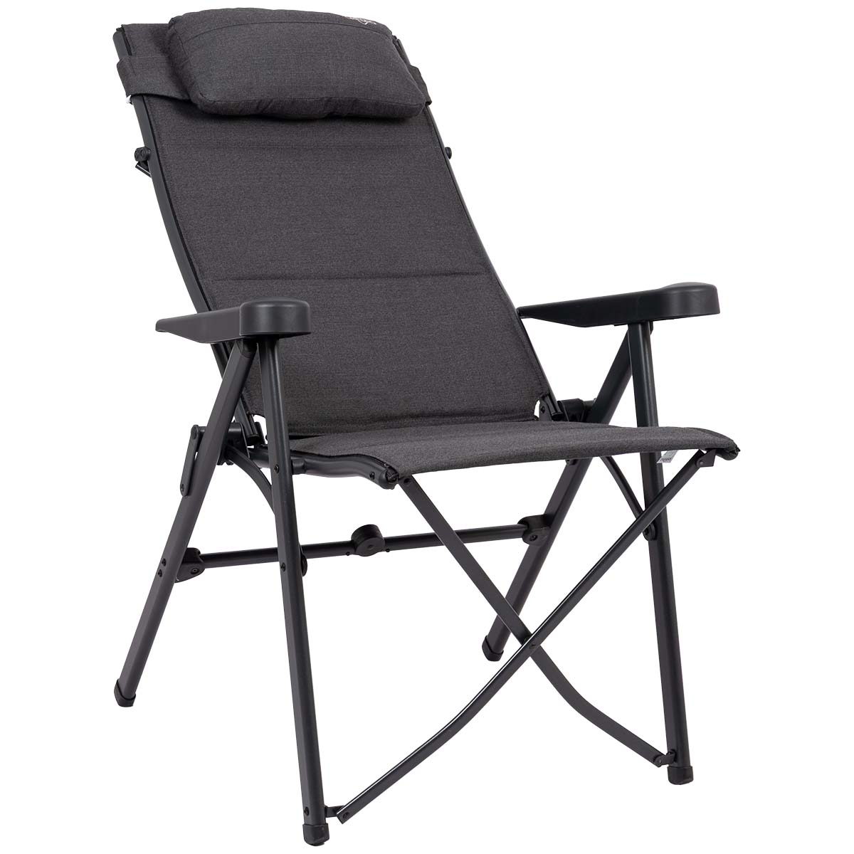 Een zeer luxe standenstoel en vouwstoel in één. De stoel heeft een hogere zit en is geschikt voor de langere mens. Deze stoel biedt maximaal comfort door de in 7 standen verstelbare rugleuning en de gepolsterde Tex-Comfort stof. Deze comfortabele stof is zeer onderhoudsvriendelijk, bestand tegen verkleuring door de zon en waterafstotend. Hierdoor is de stoel veel sneller droog dan stoelen met een traditionele schuimvulling. Ook is deze stof afneembaar en daardoor ook gemakkelijk uitwasbaar. Daarnaast zijn zowel de rugleuning, de zitting en de armleggers ergonomisch gevormd. De stoel is voorzien van een gepoedercoat verstevigd frame met safety lock. Ingeklapt is deze stoel zeer compact en daardoor gemakkelijk mee te nemen.