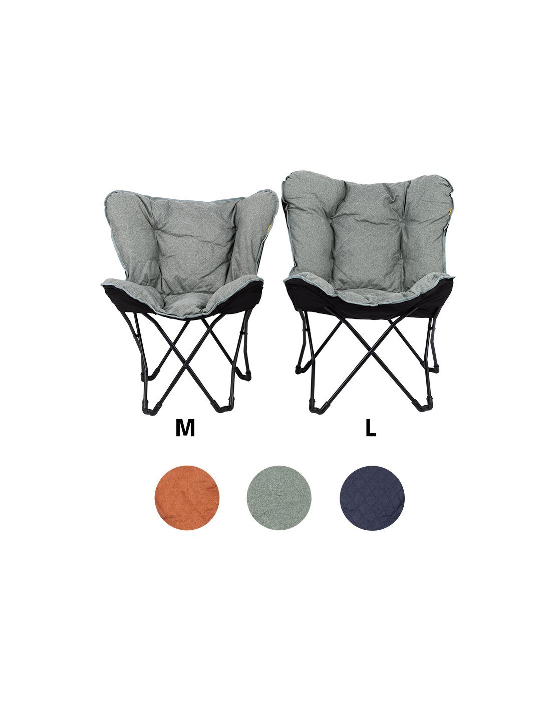 "Een 'must-have' vlinderstoel. Deze luxe stoel is voorzien van een gestikt patroon. Zeer comfortabel door de gepolsterde Cationic stof en de brede en diepe zit. Het stalen frame is eenvoudig in te klappen waardoor de stoel makkelijk mee te nemen is, inclusief draagtas. Een ideale stoel voor in de tuin of op de camping, maar ook op het balkon en in de woonkamer."